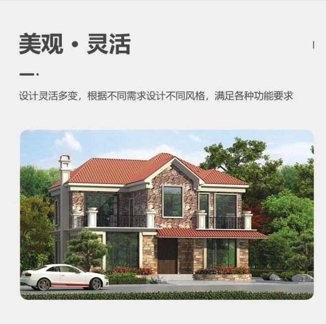 二层轻钢别墅的设计灵活,可以根据业主的需求进行个性化定制,不论是外观风格还是室内布局,都可以根据个人喜好进行调整。与传统房屋的设计固定化不同,轻钢别墅可以实现更高的自由度,给业主带来更多的设计空间