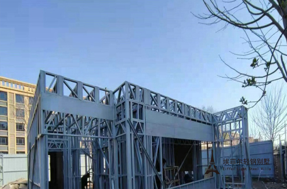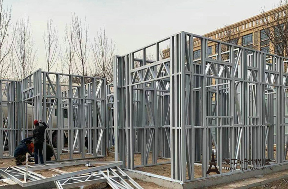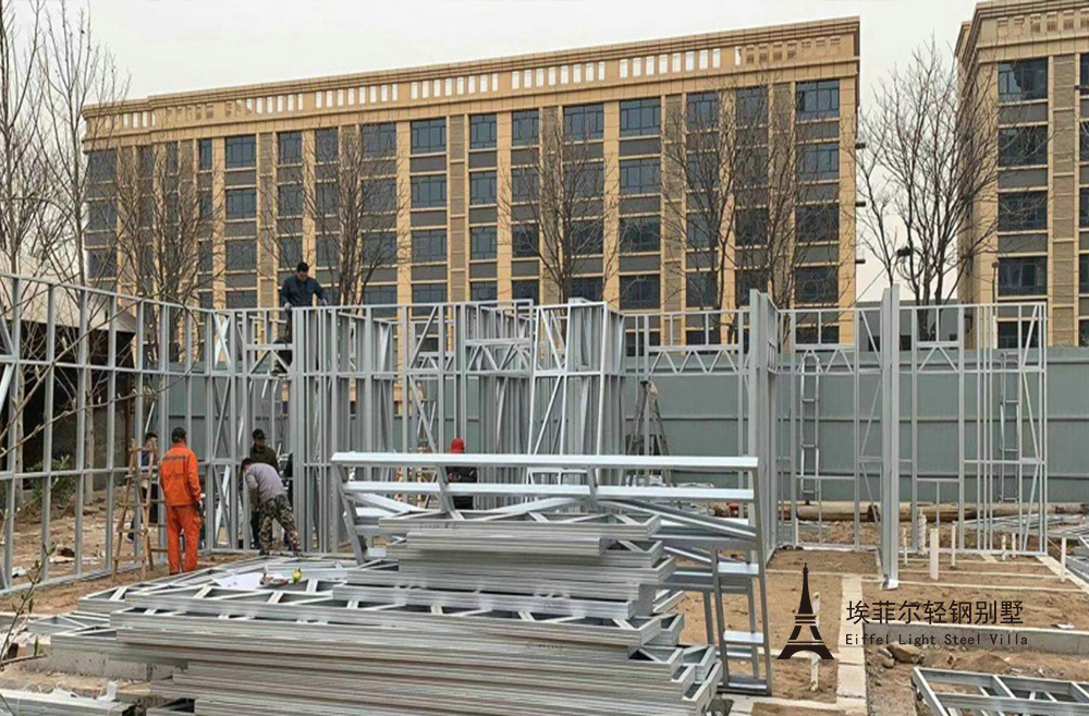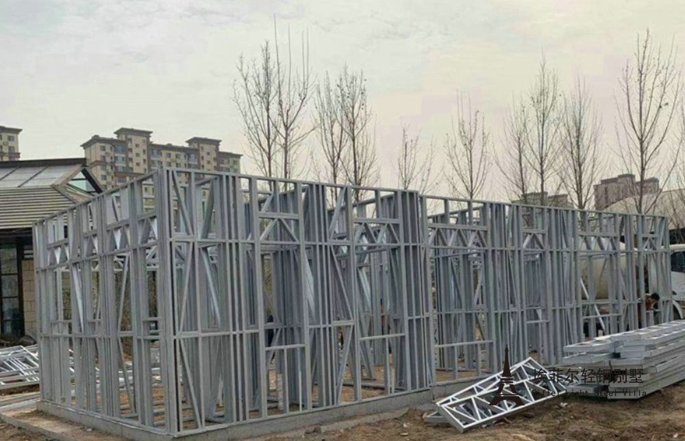 建筑龙骨:建筑主体采用埃菲尔钢结构公司双面热镀铝锌轻钢龙骨 埃菲尔钢结构公司双面热镀铝锌轻钢龙骨严格按设计图纸实现出厂前100% 预制,无需在建 造工地二次加工。现场组装过程不需要重型工程机械参与,能耗小,无粉尘,有效节约建造成本, 满足工地环保要求。施工快、工期短,为业主迅速投入使用开展房产业务和服务客户赢得了时间。
