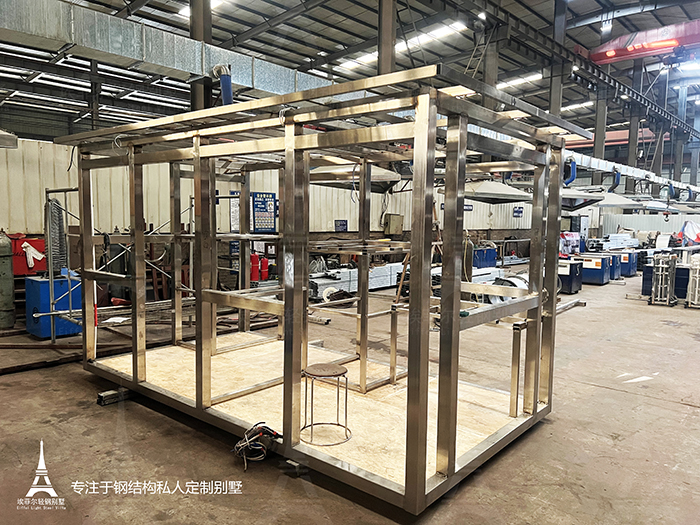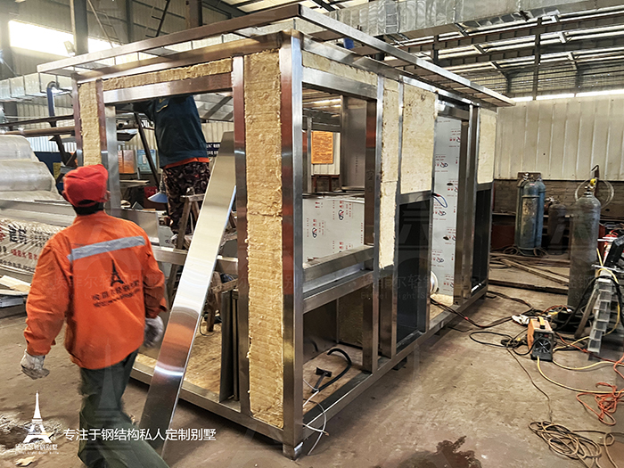 三、制作过程实景拍摄(进度说明) 1.焊接 304 不锈钢主体框架,布置线路,填充底部岩棉保温层,铺设地板垫层。